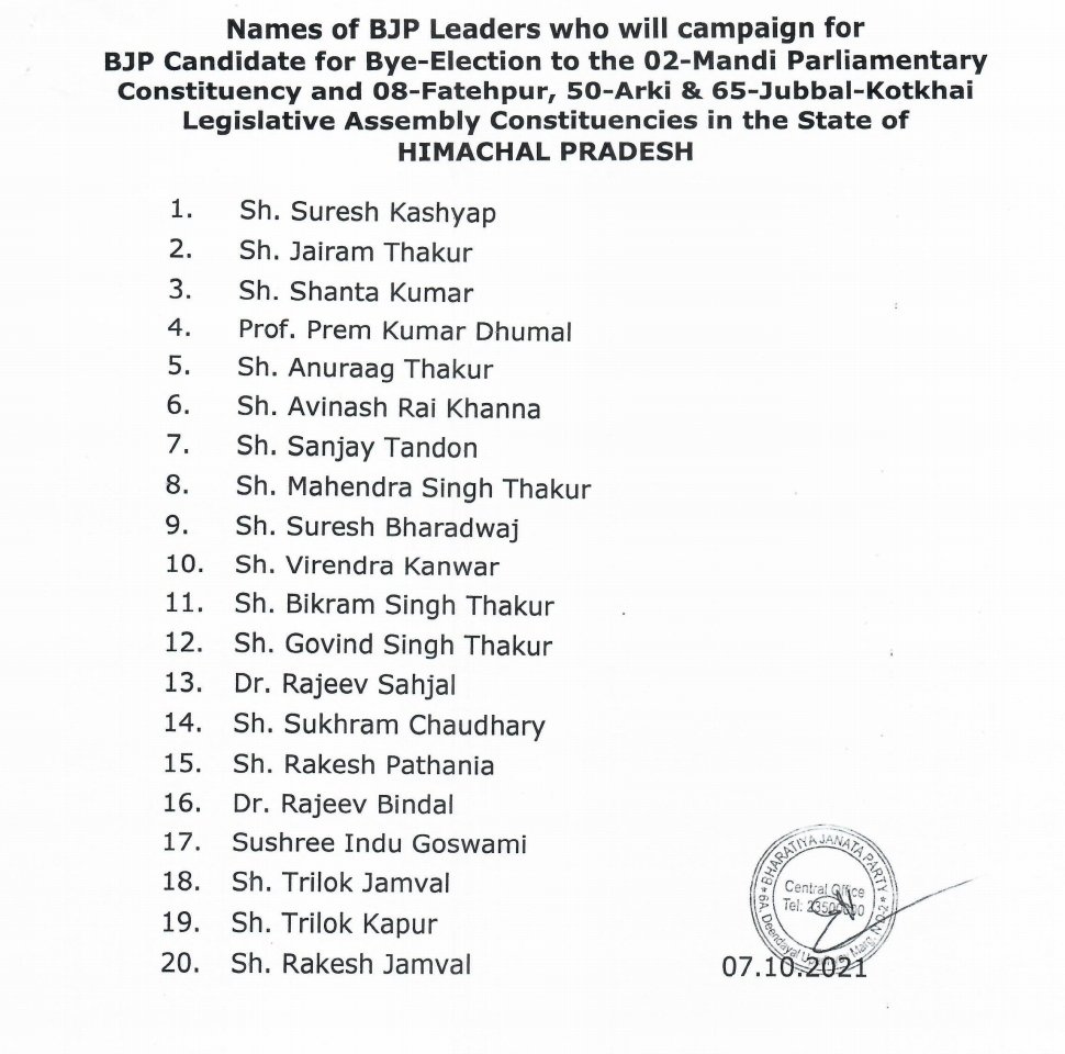 भाजपा स्टार प्रचारकों में भाजपा प्रदेश अध्यक्ष सुरेश कश्यप, मुख्यमंत्री जयराम ठाकुर, पूर्व मुख्यमंत्री शांता कुमार, पूर्व मुख्यमंत्री प्रो प्रेम कुमार धूमल, केंद्रीय सूचना एवं प्रसारण मंत्री अनुराग ठाकुर, भाजपा प्रदेश प्रभारी अविनाश राय खन्ना, प्रदेश सह प्रभारी संजय टंडन, राजस्व मंत्री मोहिंद्र सिंह ठाकुर, शहरी विकास मंत्री मंत्री सुरेश भारद्वज, पशुपालन मंत्री वीरेंद्र कंवर, परिवहन मंत्री बिक्रम सिंह ठाकुर, शिक्षा मंत्री गोविंग सिंह ठाकुर, पूर्व भाजपा प्रदेश अध्यक्ष डॉ राजीव सैजल, ऊर्जा मंत्री सुखराम चौधरी, वन मंत्री राकेश पठानिया, सस्थ्य मंत्री डॉ राजीव बिंदल, राज्य सभा सांसद इंदू गोस्वामी, भाजपा प्रदेश महामंत्री त्रिलोक जम्वाल, त्रिलोक कपूर एवं राकेश जम्वाल शामिल है।
