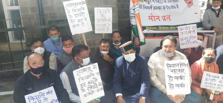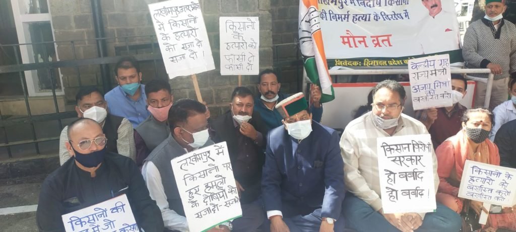 यूपी के लखीमपुर खीरी में किसानों के साथ हुई घटना के विरोध में कांग्रेस द्वारा आज देश भर में मौन प्रदर्शन किया जा रहा है। राजधानी शिमला में भी कांग्रेस द्वारा राजभवन के बाहर मौन प्रदर्शन किया। सुबह 11 बजे कांग्रेस के कार्यकर्ता मौन पर बैठने के किये राजभवन पहुचे लेकिन सुरक्षा कर्मियों ने राजभवन के गेट के सामने बैठने से रोक दिया जिसके चलते कुछ देर तक कांग्रेस कार्यकर्ताओं की सुरक्षा कर्मियों से बहस बाजी होती रही। जिसके बाद कांग्रेस अध्यक्ष कुलदीप राठौर राजभवन के बाहर ही धरने पर बैठ गए।