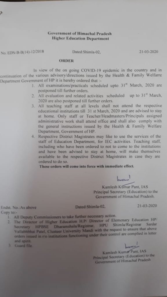 देशभर में चल रही कोविड-19 महामारी के दृष्टिगत एवं स्वास्थ्य और परिवार कल्याण विभाग द्वारा जारी विभिन्न दिशा-निर्देशों के कारण प्रदेश सरकार ने 31 मार्च, 2020 तक होने वाली परीक्षाओं और प्रैक्टिकल को आगामी आदेशों तक स्थगित कर दिया है।