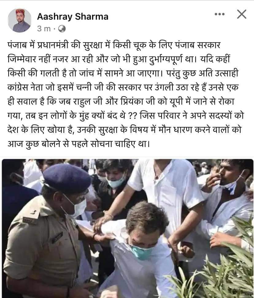 प्रधानमंत्री सुरक्षा चूक मामले में पंजाब सरकार पर निशाना साधने के बाद जहां ऊना के विधायक सतपाल रायजयादा ने विक्रमादित्य सिंह को चुप रहने की नसीहत दी थी। वहीं अब मंडी से पंडित सुखराम के पौते व कांग्रेस नेता आश्रय शर्मा ने अति उत्साही कांग्रेस नेता पर सवाल उठाए हैं कि जब कांग्रेस नेता राहुल गांधी व प्रियंका वाड्रा को उत्तर प्रदेश में जाने से रोका गया था तो फिर क्यों मौन धारण किया था। हालांकि आश्रय ने अपनी फेसबुक पोस्ट में किसी कांग्रेस नेता के नाम का जिक्र नहीं किया है।