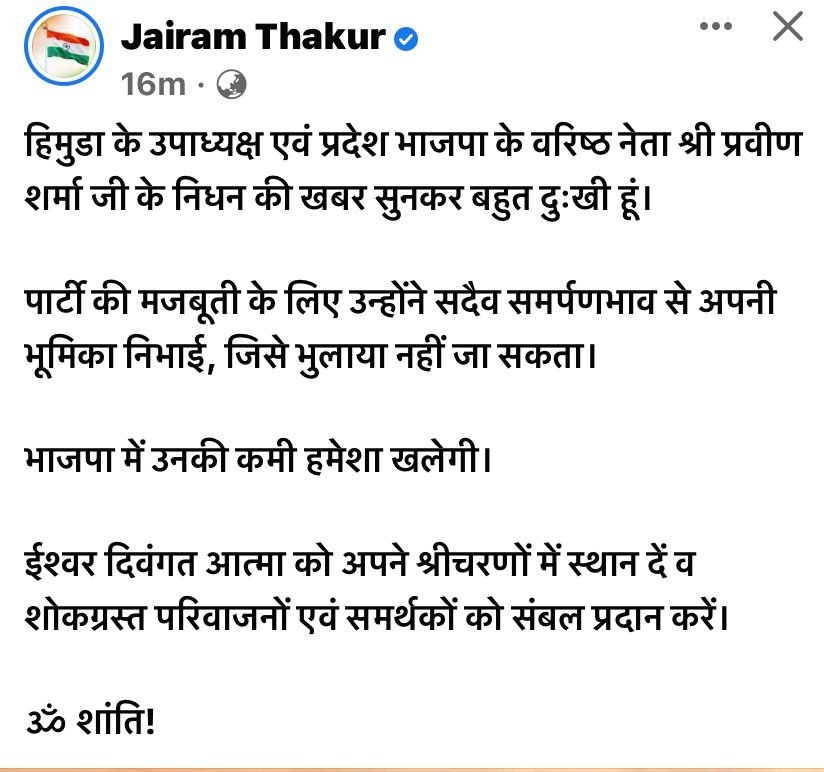 हिमुडा के उपाध्यक्ष व वरिष्ठ भाजपा नेता प्रवीण शर्मा का निधन हो गया है। उन्होंने आज ऊना में अंतिम सांस ली।वर्तमान सरकार में उन्हें हिमुडा का उपाध्यक्ष बनाया गया था लेकिन ज्यादा सक्रिय नहीं रहे। वह कुछ समय से अस्वस्थ चल रहे थे। भाजपा नेता कर्ण नन्दा ने उनके निधन की सूचना दी। उनके निधन से परिवार जन और भाजपा में शोक की लहर है। उन्होंने प्रवीण शर्मा के निधन को भाजपा कर लिए बड़ी क्षति बताया और शोक संतप्त परिवार के प्रति संवेदना व्यक्त करते हुए इस दुःख को सहन करने की क्षमता प्रदान करने के लिए प्रार्थना की।