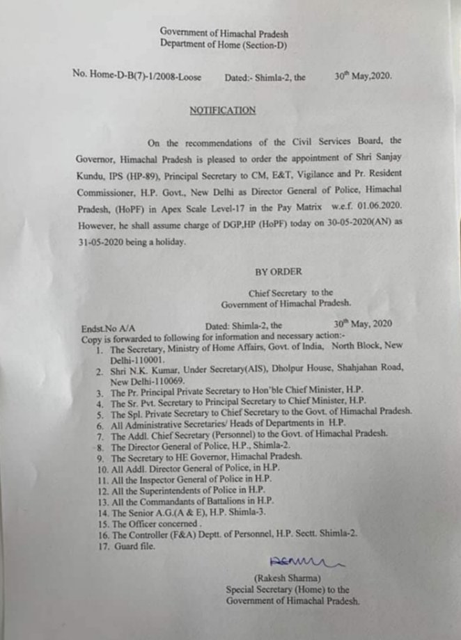 हिमाचल सरकार के सबसे तेजतर्रार अधिकारी संजय कुंडू हिमाचल प्रदेश के नए डीजीपी होंगे। वे एक जून से पदभार ग्रहण करेंगे।